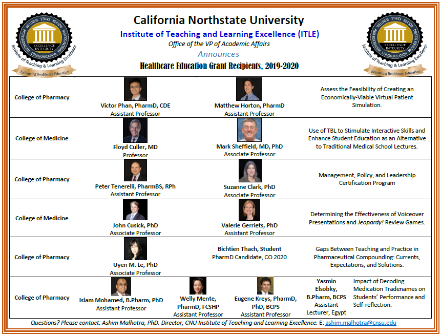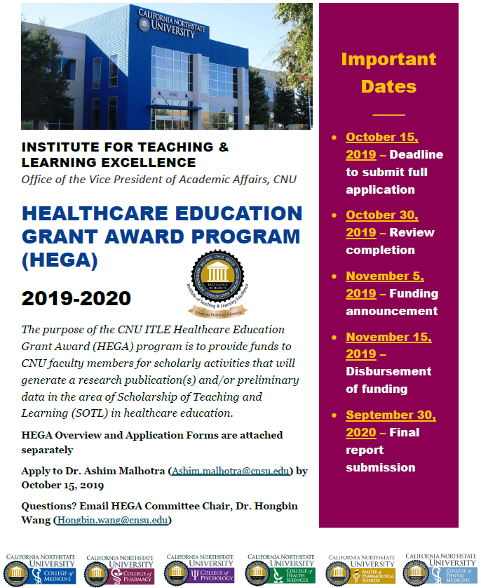 ITLE's strives to incentivize CNU faculty from all of its six colleges to think about, innovate in, design and implement, and assess Scholarship of Teaching and Learning (SOTL) projects that are learned-centered and enhance the teaching and learning environment. With this in mind, in 2019-2020, the “Health Education Grant Award” (HEGA) was created.